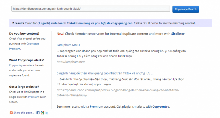 Do đây, bạn đang sử dụng phiên bản miễn phí nên không thể thực hiện tìm kiếm chuyên sâu và phân tích kết quả quá chi tiết được. Nó chỉ đánh giá tính trùng lập nội dung trên website khá trung trung và không quá chi tiết đâu nhé.