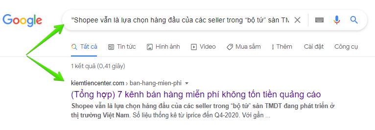 Dán ở thanh search Google để ở giữa 2 dấu “.....”, kết quả tìm kiếm sẽ cho ra những website nào đang có đoạn văn nào giống như đoạn mà bạn đã search (bao gồm cả website bạn).